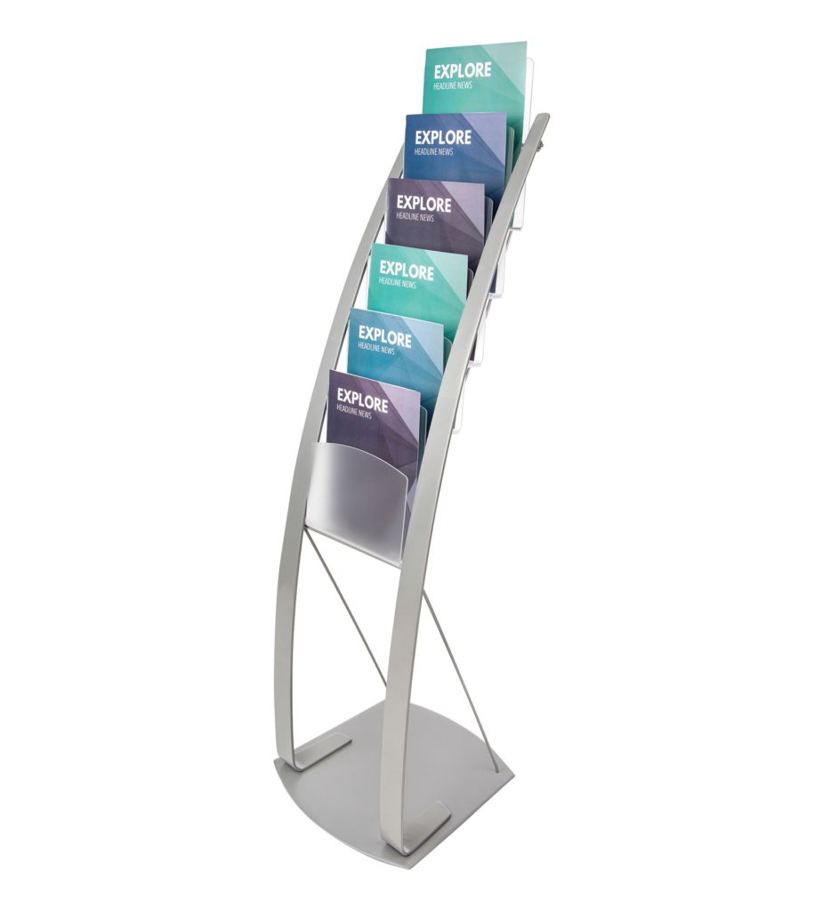 Our stylish and elegant free-standing brochure/magazine displays have a powder coated steel base and curved side supports and are available in gloss silver or matt black finish. The frosted acrylic literature pockets are 240mm wide, for A4 portrait brochures and magazines.